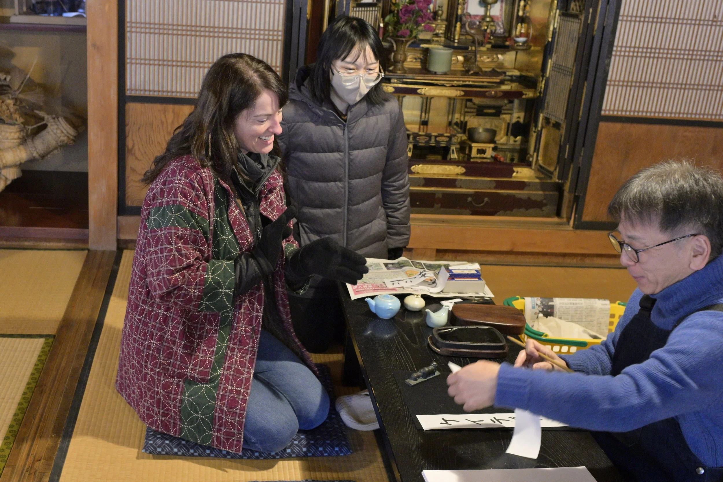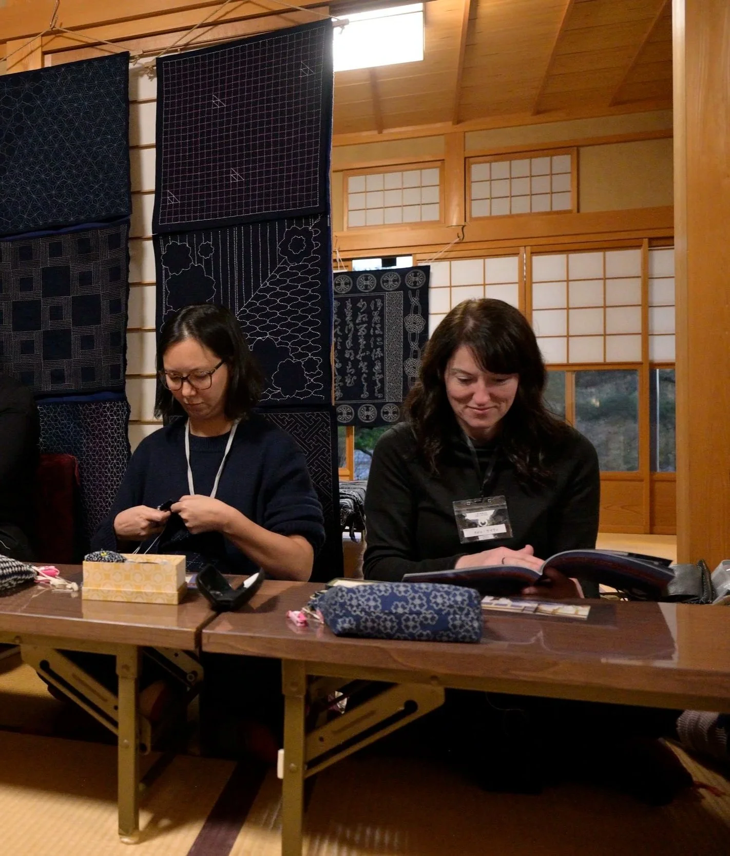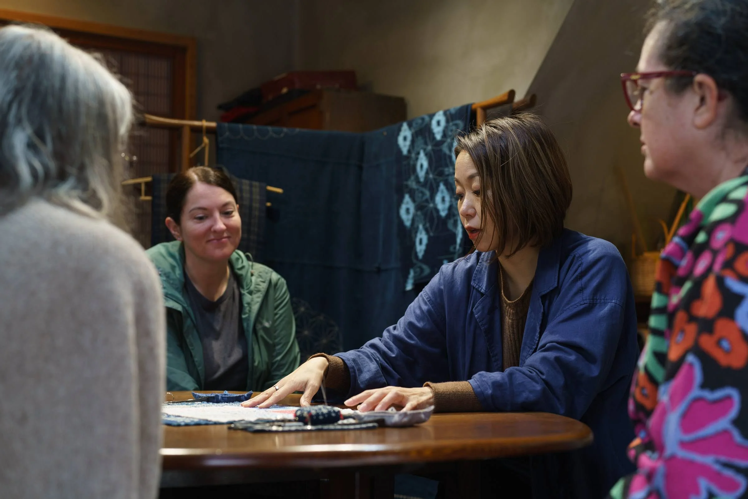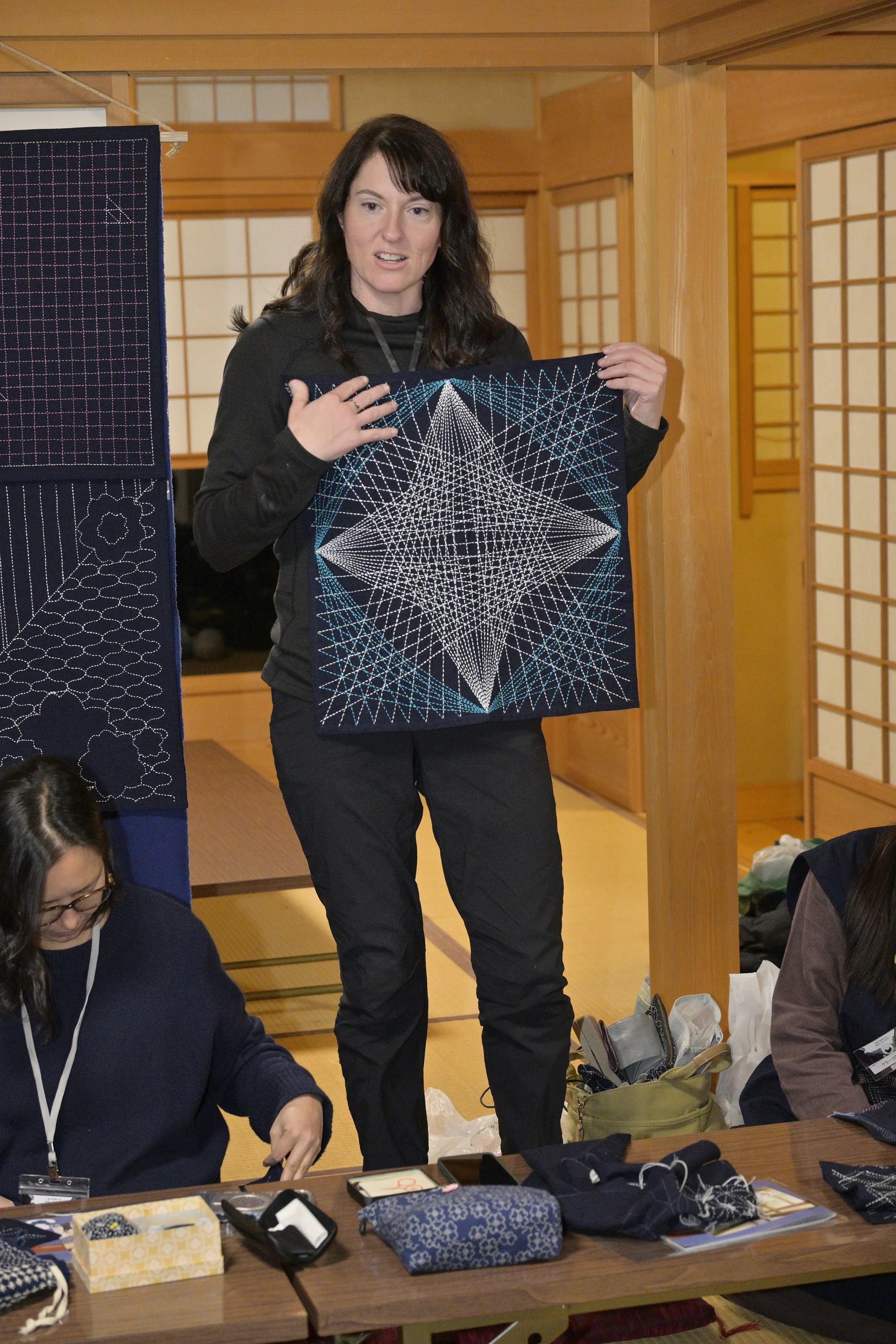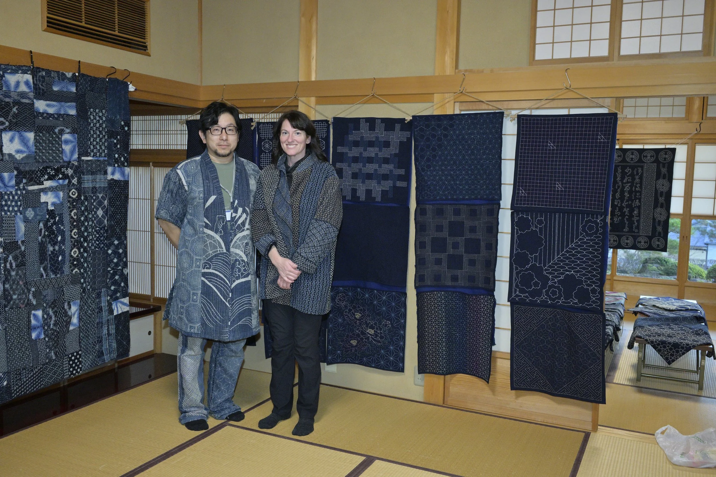 My relationship to sashiko is rooted in deep respect for the craft and for the Japanese people who have sustained it. I am a lifelong student. I am learning the Japanese language, and I have traveled to Japan multiple times to study sashiko directly with teachers across the country, including in Kyoto, Takayama, Tokyo, Osaka, and Otsuchi. I have been welcomed by and learned alongside Japanese teachers and students, and my work has been received with encouragement and care.